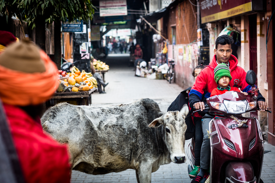 Cows, motorists, and pedestrians compete for space in the narrow streets.