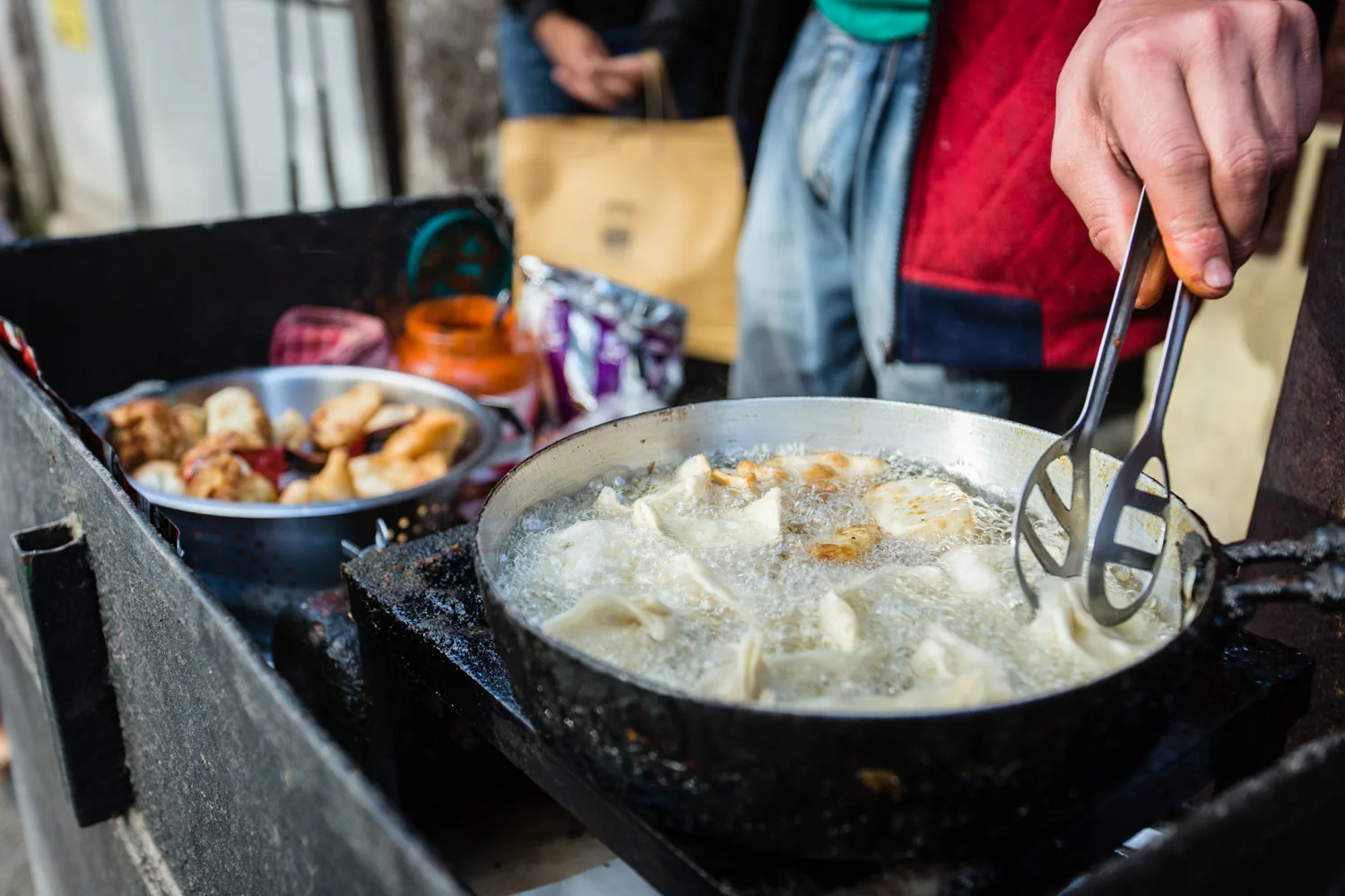 Momos, a Tibetan dumpling, are available on the cheap from street stalls.