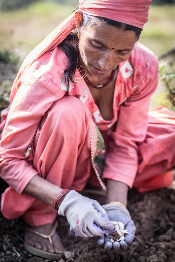 Pushkpa Thakur, groundskeeper at the Dharmalaya Institute, demonstrating how to plant garlic.