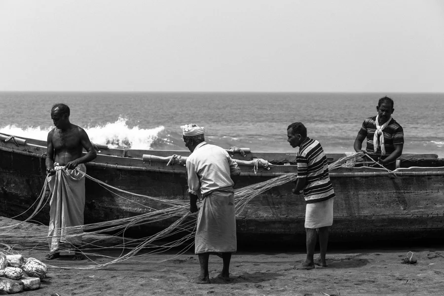 Varkala fisherman folding their nets.