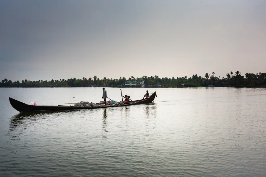 Villagers transporting rocks for construction through the backwaters near Alleppey.
