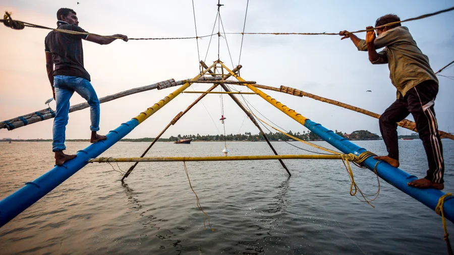 Kochi fisherman raising a shore operated lift net (known informally in India as a Chinese fishing net).