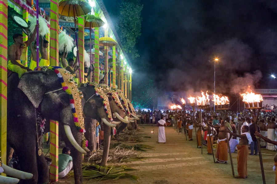 A Ganesh temple ceremony in Kochi. Ganesh is an elephant-headed deity associated with new beginnings. This ceremony boasted 19 elephants.