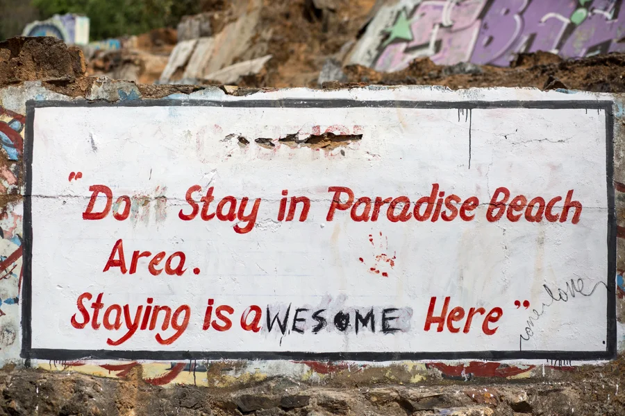 Paradise Beach used contain a several beachfront huts and cafes. The government demolished the businesses as they were built illegally on protected land. The remaining concrete foundations bear the graffiti gifted by travelers passing through the beach.