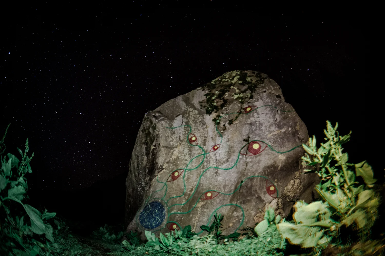 Rock art in the Rainbow Gathering campsite. The Rainbow Family has been criticized leaving its mark in the environmentally sensitive areas, such as national forests or grazing lands, where Gatherings are typically held.