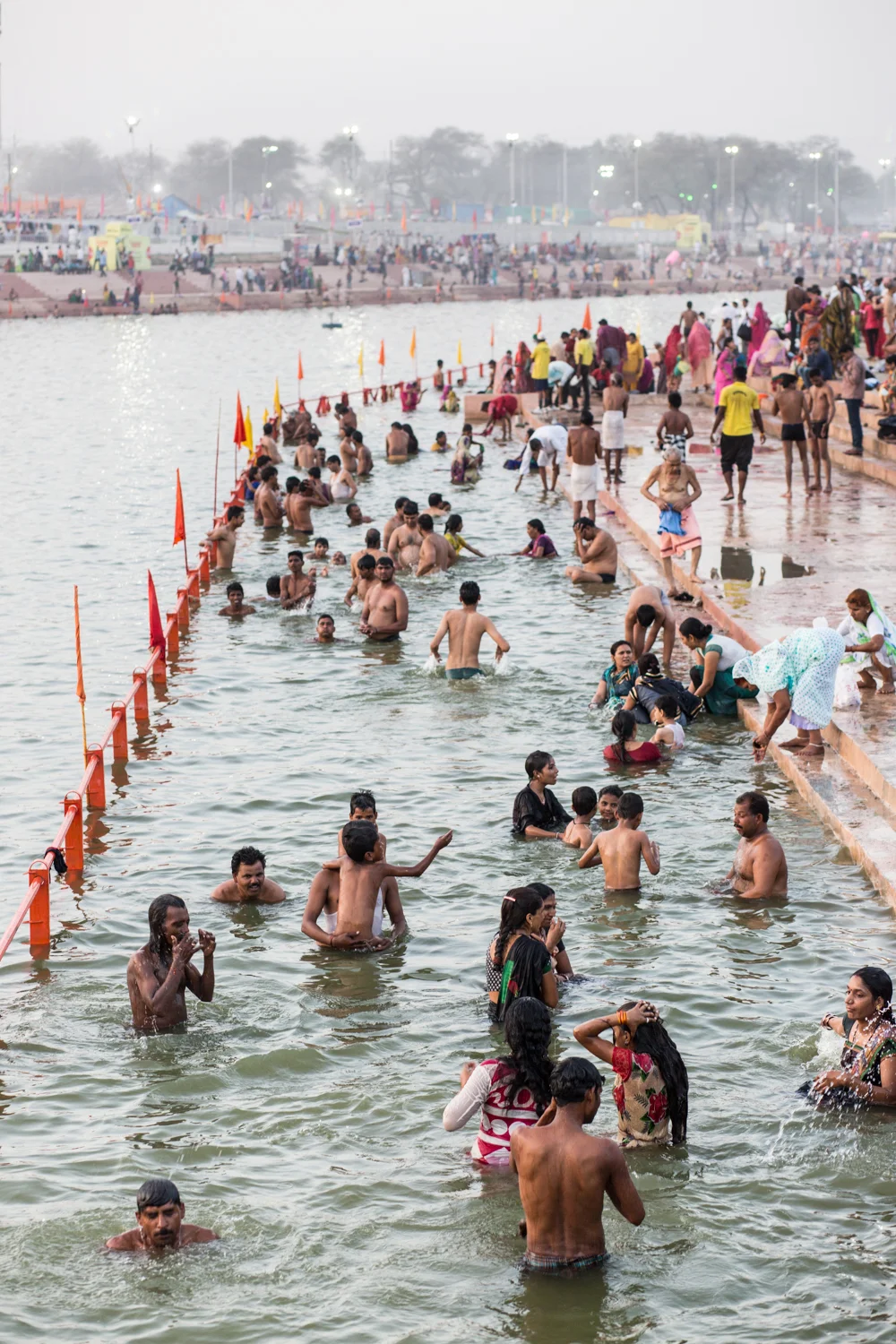 Kumbh Mela visitors in the Shipra River. An estimated 70 millions visitors came to bathe in the Shipra during the month long festival.
