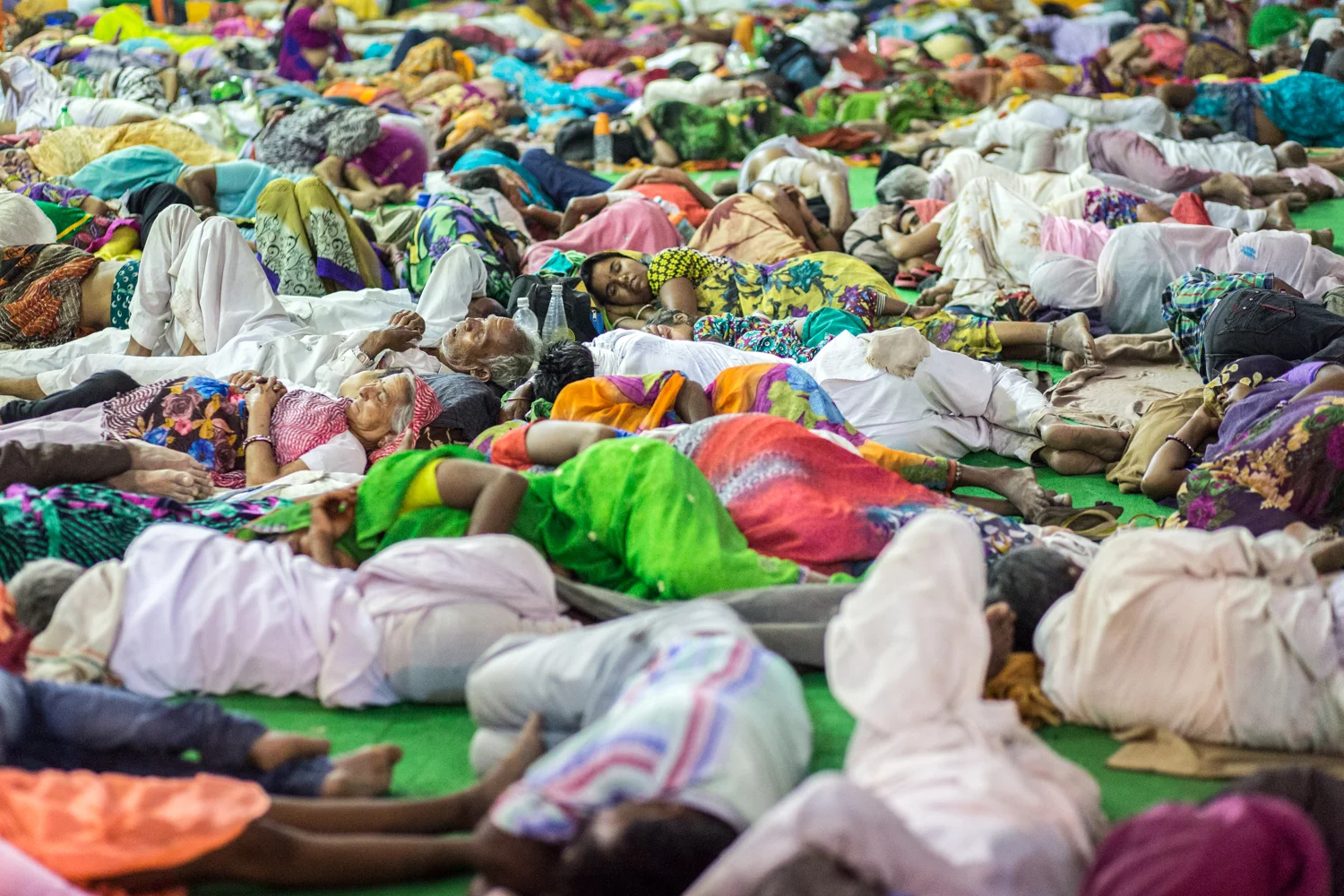 Ornate palace-like tents with steeple facades and lights on strings — reminding me of the entrance to a Disneyland ride — loomed like goliathan Christmas trees. Large, cavernous rectangular tents, illuminated by vibrant shades of green and pink, emanated devotional music from blaring from amplifiers. Clumps of smaller tents filled any space available between the larger tents and contained souvenir stalls or sleeping Sadhus (Hindu monks) curled up in their patent orange robes, looking like tigers sprawled out after a feast. Stands selling chai tea and snacks punctuated the areas around the tents. People were everywhere — sleeping, eating, brushing teeth, urinating — virtually the full gamut of domestic activity hung out to dry anywhere that a little bit of push or bootstrapping could make it fit. Although it was already past midnight, families, many of them with little children were, still on the move. The temperature at night was in the high 90s and many parents vouchsafed a midnight swim to their children and themselves.