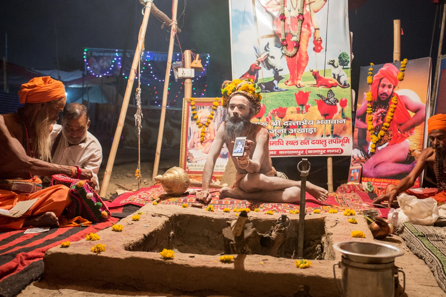 Inside the tents, we were served with sugary drinks and offered puffs from marijuana cigarettes or chillum (a pipe used for smoking marijuana). “I heard the river is drying?” I asked a young Sadhu whose bearded face was pictured on a poster outside the big orange tent we were in at the time. “No river no cry,” he quipped without missing a beat nor breaking his gaze from the smart phone in his hand. Another Sadhu lumped coins into a jar that a worshipper had just left by his feet. It’s easy to see without looking to far that not much is really sacred, I thought to myself, wondering who, if anyone, actually bought into the spectacle. It all felt so denuded of meaning, a henhouse with a rooster crucifix.