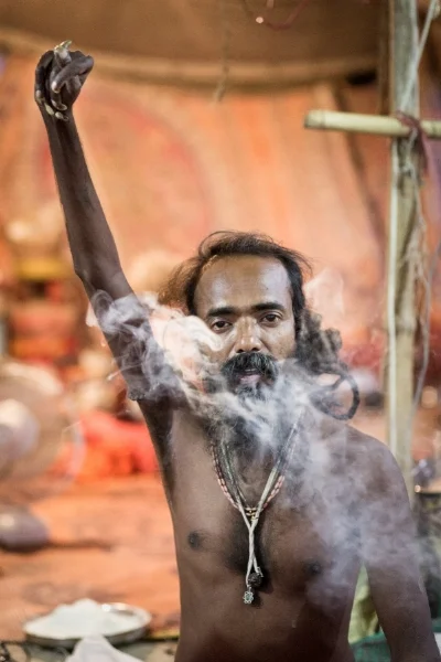 This sadhu, imbibing a joint, says he has kept his hand raised for six years. You can observe that his raised hand is deformed. Sadhus take on such ascetic assignments, which fall under the yogic practice of pratyahara or "sensory withdrawal," to prove their devotion.