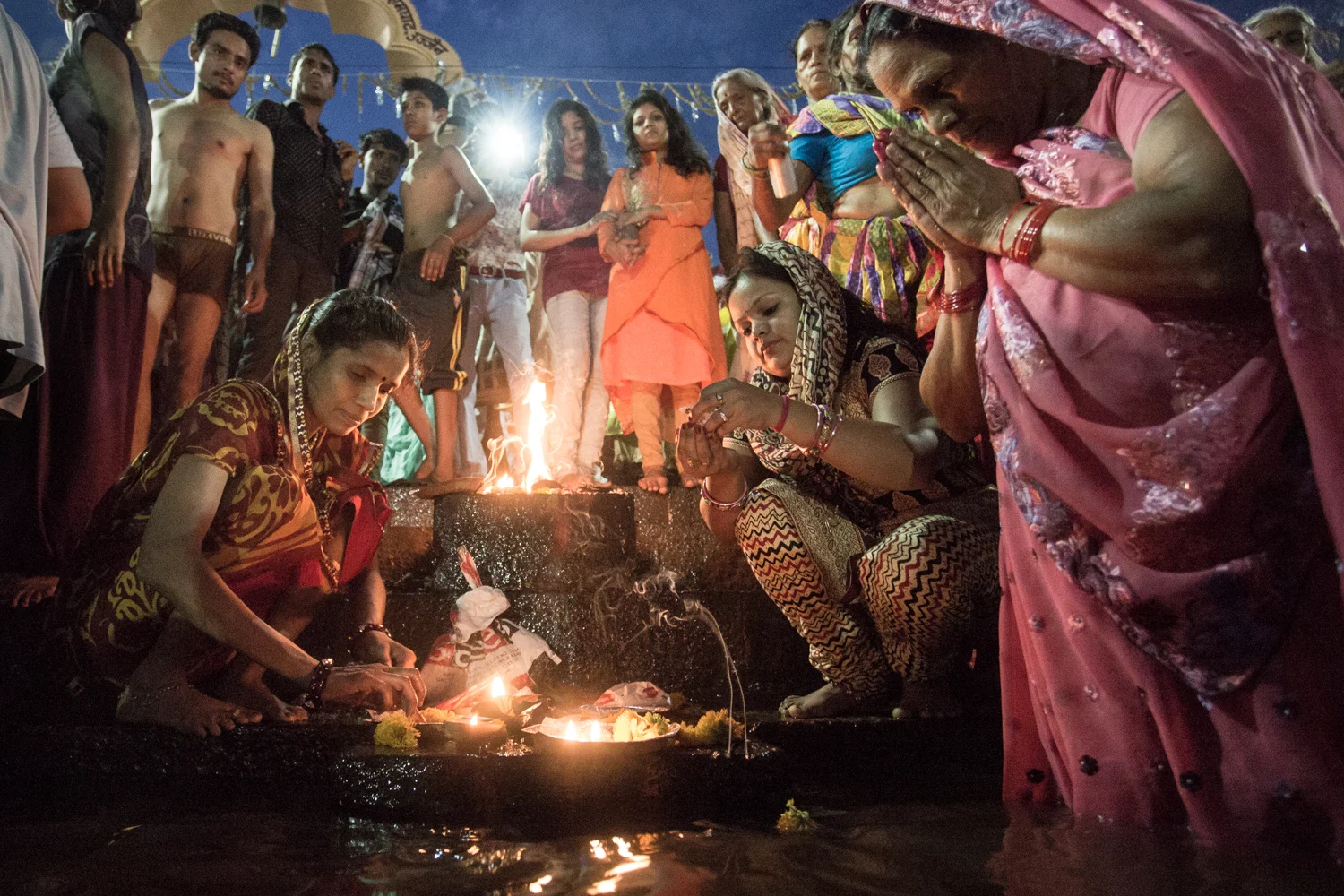 At the water’s edge, women vied for space to perform fire pujas or release oblations into the water. Their saris clung to their wet bodies creating shapes reminiscent of the soft curvature of the winding Shipra. A scoff broke out between two women as one knocked over another’s jar for collecting river water, spilling amrita over the back of an old man whom a younger man was stabilizing so that he could kneel in the shallows. Around him, a few people prayed intently with clasped hands but most just lounged around taking in the atmosphere. Deeper in the river, spurred on by Frites, teenagers splashed one another. Every now and then a uniformed man floating past on a dingy would blow his whistle at them. As soon as he left Frites rallied the youths with cries of “Om nama Shiva!”.