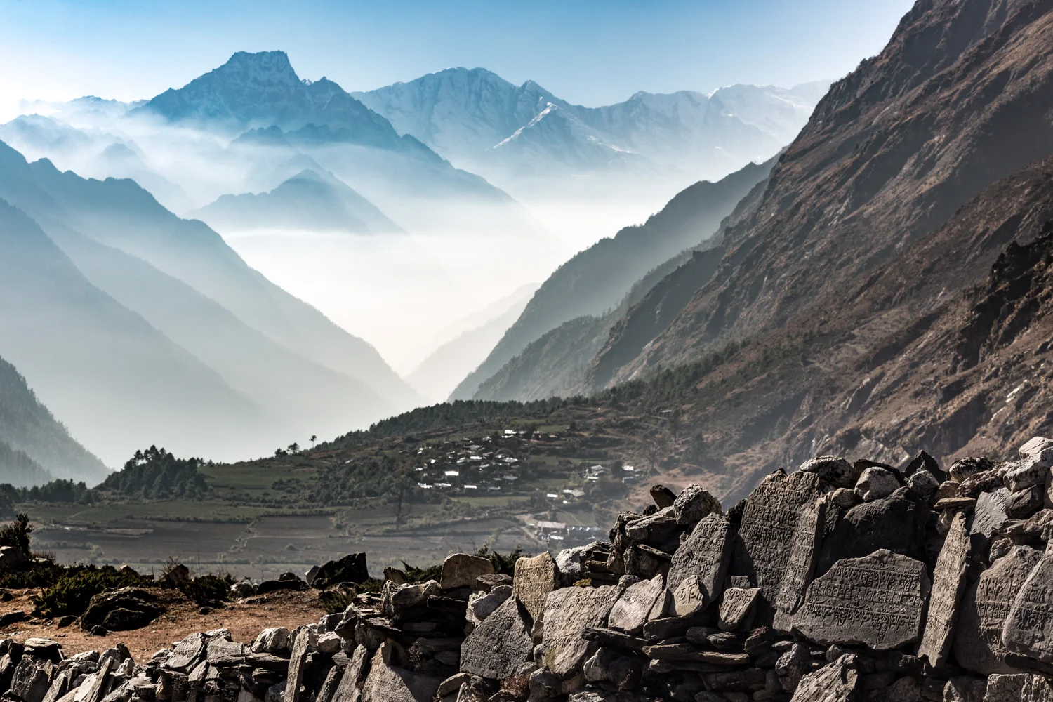 Tsum Valley. In the foreground are mani stones bearing Budhist mantras in memory of deceased persons.