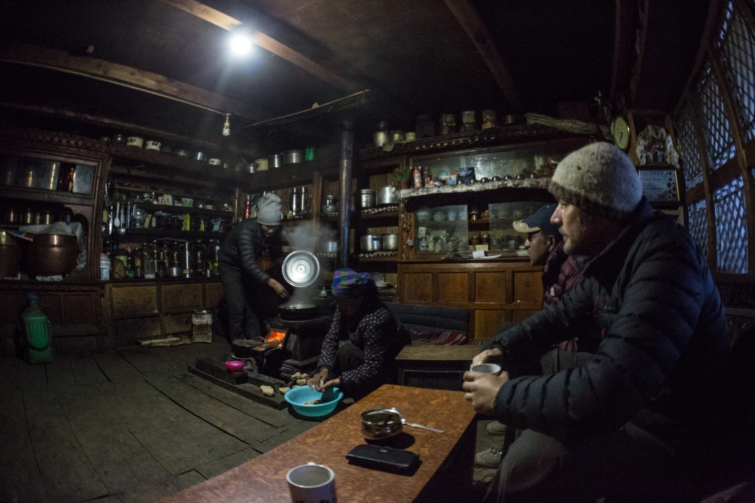A villager keeps warm by a fire in the village of Namrung located in the Manaslu reserve.