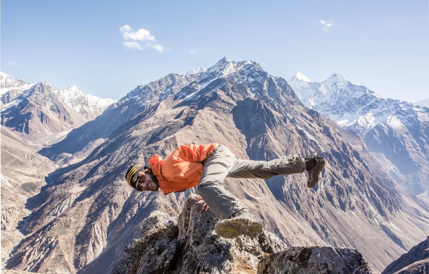 Popping a yoga pose in front the Ganesh ("elephant") massif, which border Tsum to the east. Photograph by Rob Fuldner.