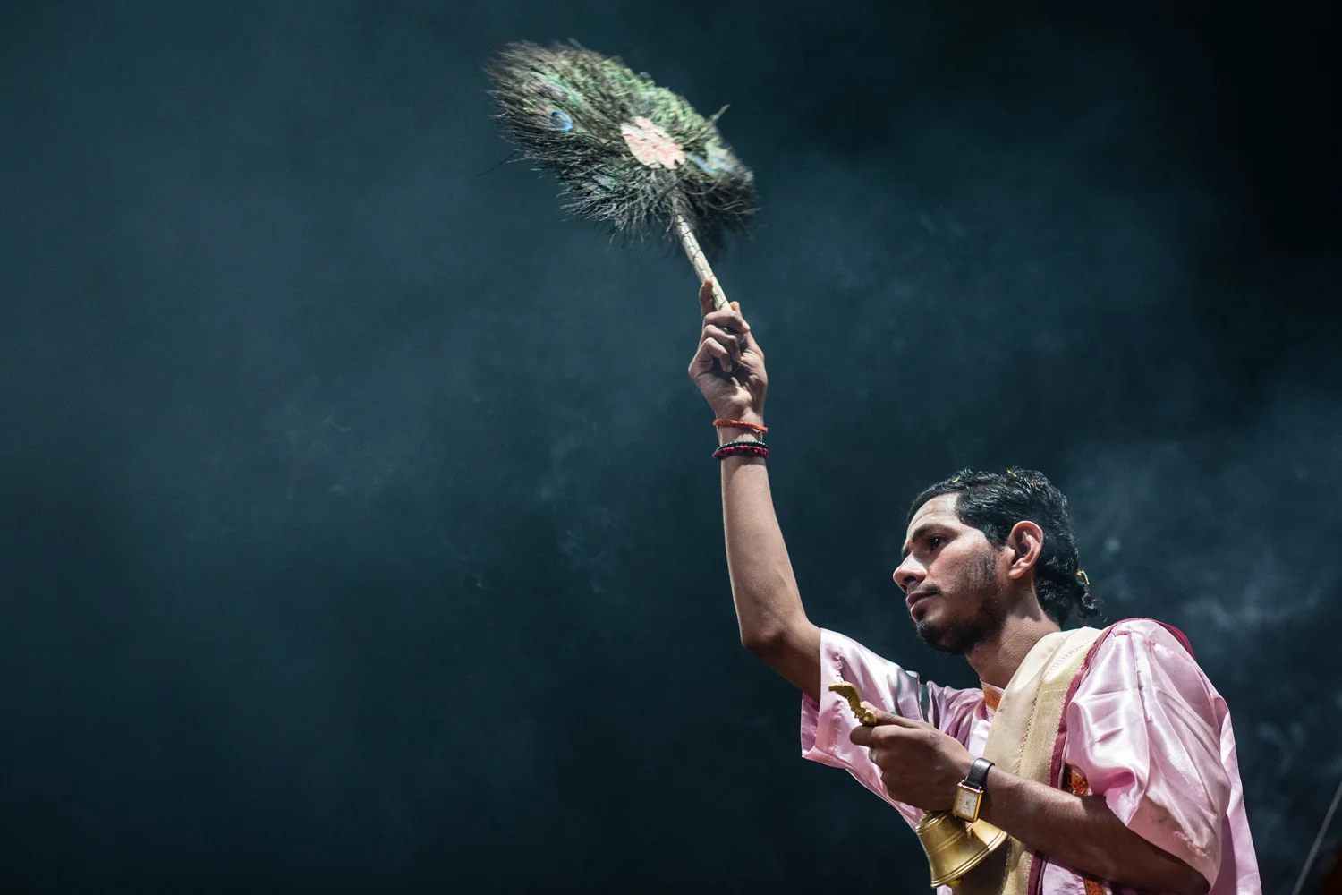 A priest participating in a Ganga Aarti. An Aarti is a ritual of Hindu worship usually performed at the end of a Pūjā — a prayer ceremony honoring Hindu deities or celebrating an event. During the ceremony, participants release oblations — usually in the form ghee soaked wicks — into the fire and chant devotional hymns.