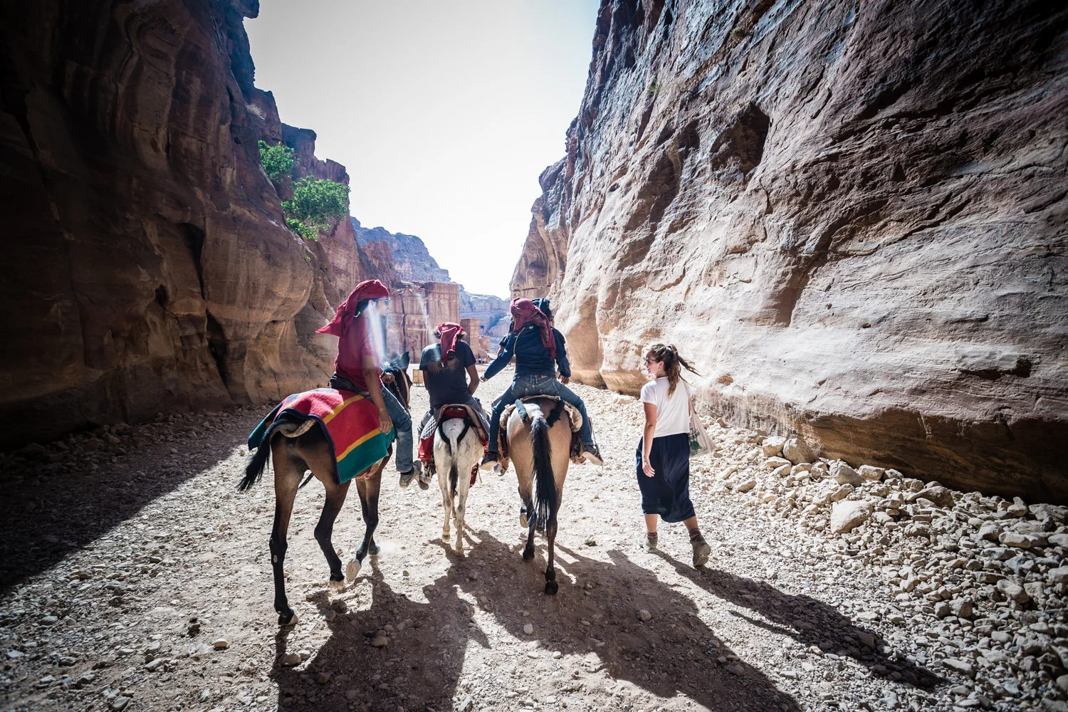 A bedouin horse-buggy carts tourists through the Siq's narrow corridor.